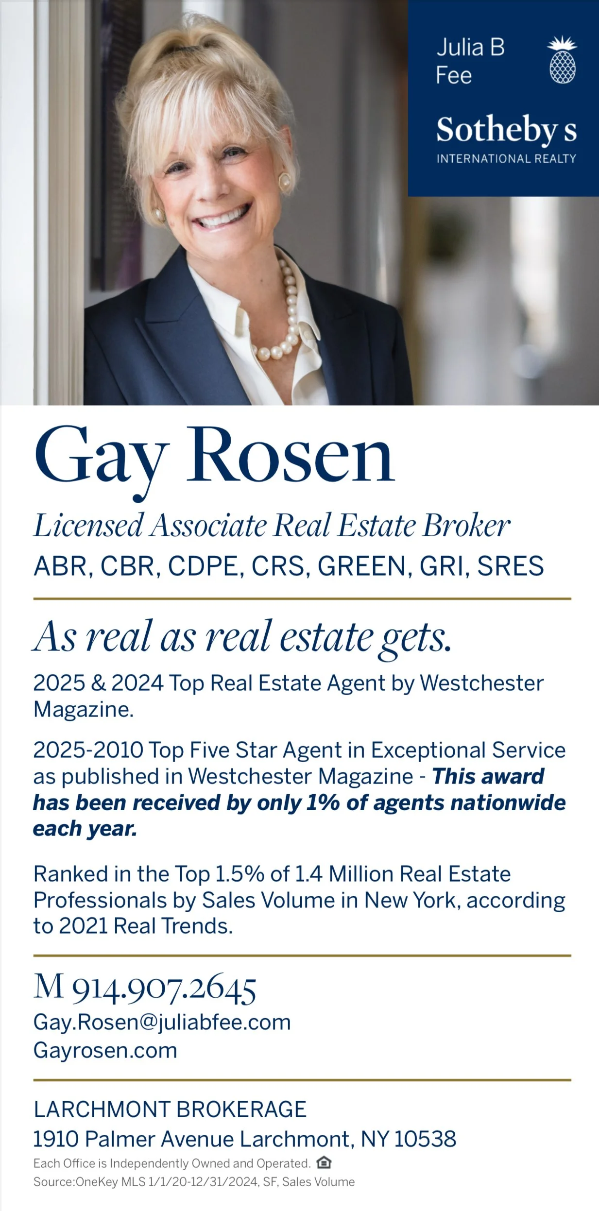 Gay is diligent, caring, driven and thorough (with a sense of humor). She is always thrilled when clients refer their friends and associates, and she has the experience, compassion, and commitment to help you realize your real estate goals. Whether it is buying or selling a small coop or a luxurious estate, Gay's attentiveness to customers, sharp negotiation skills and creativity has served her well with ongoing referrals, and repeat business from a loyal, satisfied following. She hopes you will take a few minutes to review her many client testimonials as this here is the best way of finding out about Gay's work ethic and personality.